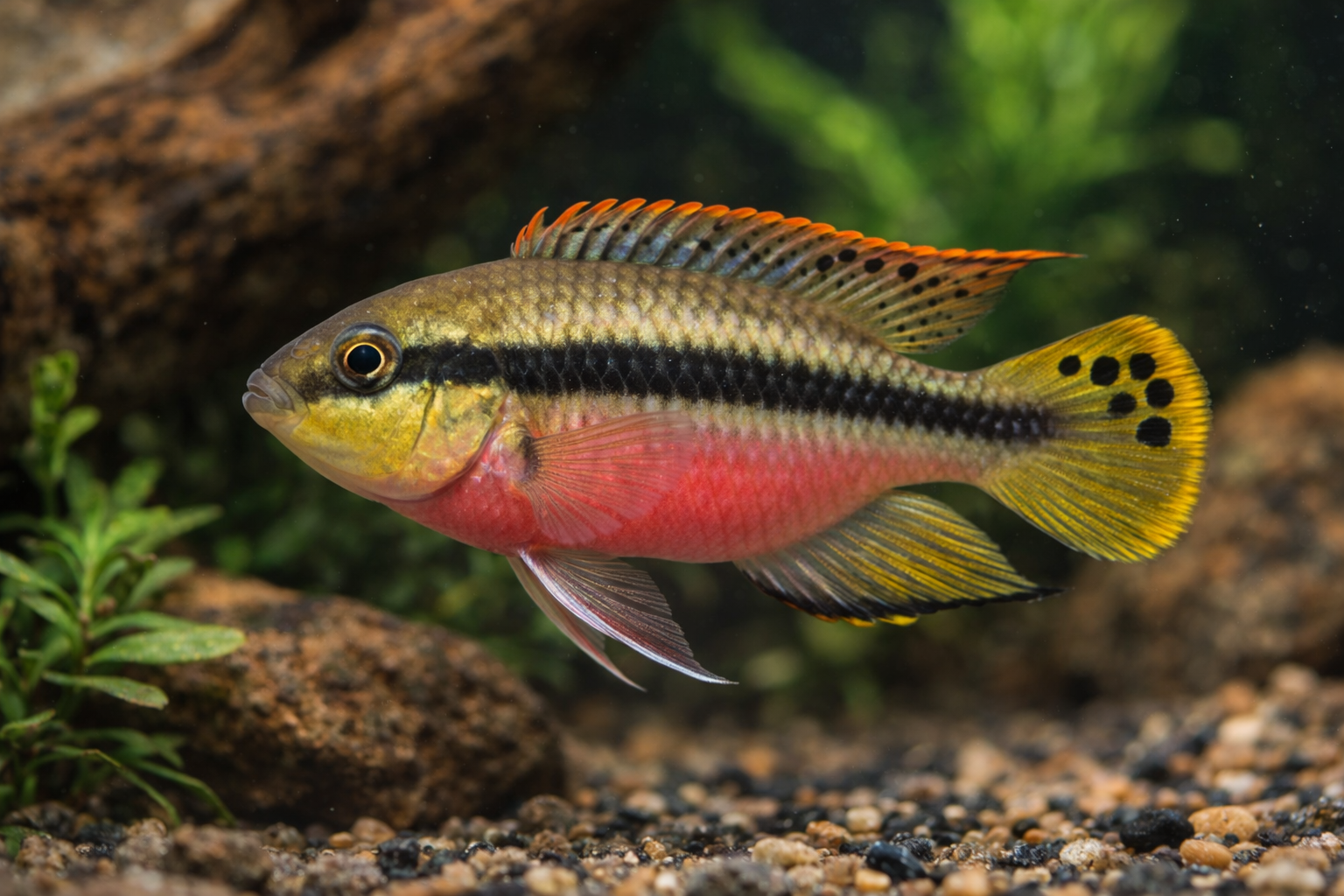 De kersenbuik cichlide, of Pelvicachromis pulcher, is een favoriete keuze onder aquariumliefhebbers vanwege zijn unieke uiterlijk en levendige karakter. Deze vis heeft een gedrongen lichaam, met een opvallende felrode buik en schitterende blauw-groene schubben. Mannetjes onderscheiden zich door hun langere, puntigere vinnen, terwijl vrouwtjes een vollere lichaamsbouw hebben. Deze sociale vissen gedijen het beste in een gezelschapsaquarium dat voldoende schuilplaatsen biedt. Ze zijn relatief eenvoudig te verzorgen, maar vereisen een goed onderhouden omgeving met een stabiele waterkwaliteit en een temperatuur tussen 24-28°C. De kersenbuik cichlide brengt kleur en dynamiek in elk aquarium, waardoor hij een aantrekkelijke aanvulling is voor zowel beginners als ervaren aquarianen. De kersenbuik cichlide, afkomstig uit West-Afrika, is een populaire keuze voor zoetwateraquaria. Deze kleurrijke vis gedijt in langzaam stromende rivieren en beekjes, waar hij zich voedt met insectenlarven, kleine schaaldieren en algen. Voor een optimaal aquariumklimaat is een temperatuur tussen 24 en 28 graden Celsius ideaal, met een pH-waarde van 6,5 tot 7,5. Deze cichlide is sociaal, maar kan territoriaal zijn, vooral tijdens het broedseizoen. Zorg voor voldoende schuilplaatsen en ruimte om te zwemmen. Een gevarieerd dieet met speciaal voer voor cichliden, aangevuld met plantaardig materiaal, bevordert de gezondheid en levendigheid van deze prachtige vissen.